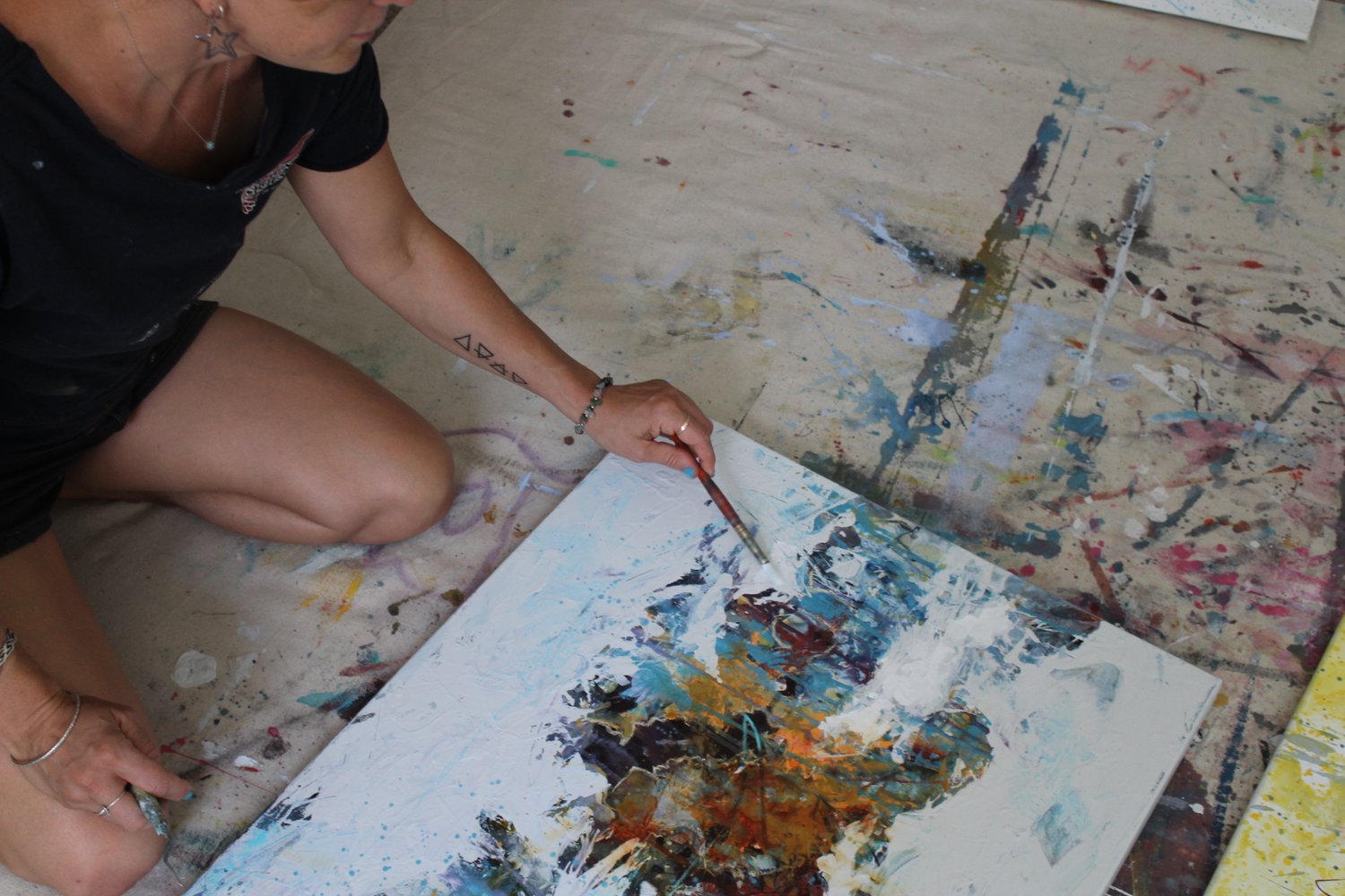 Leigh’s next exhibition, Reciprocity, is set to open at Saratoga Arts on October 11 (opening night will feature an artist talk at 6:30pm) and run through November 1. While she’s recently entered the world of painting pet portraits, Leigh’s upcoming exhibit will consist mostly of her abstract pieces inspired by nature and created using old house paint.