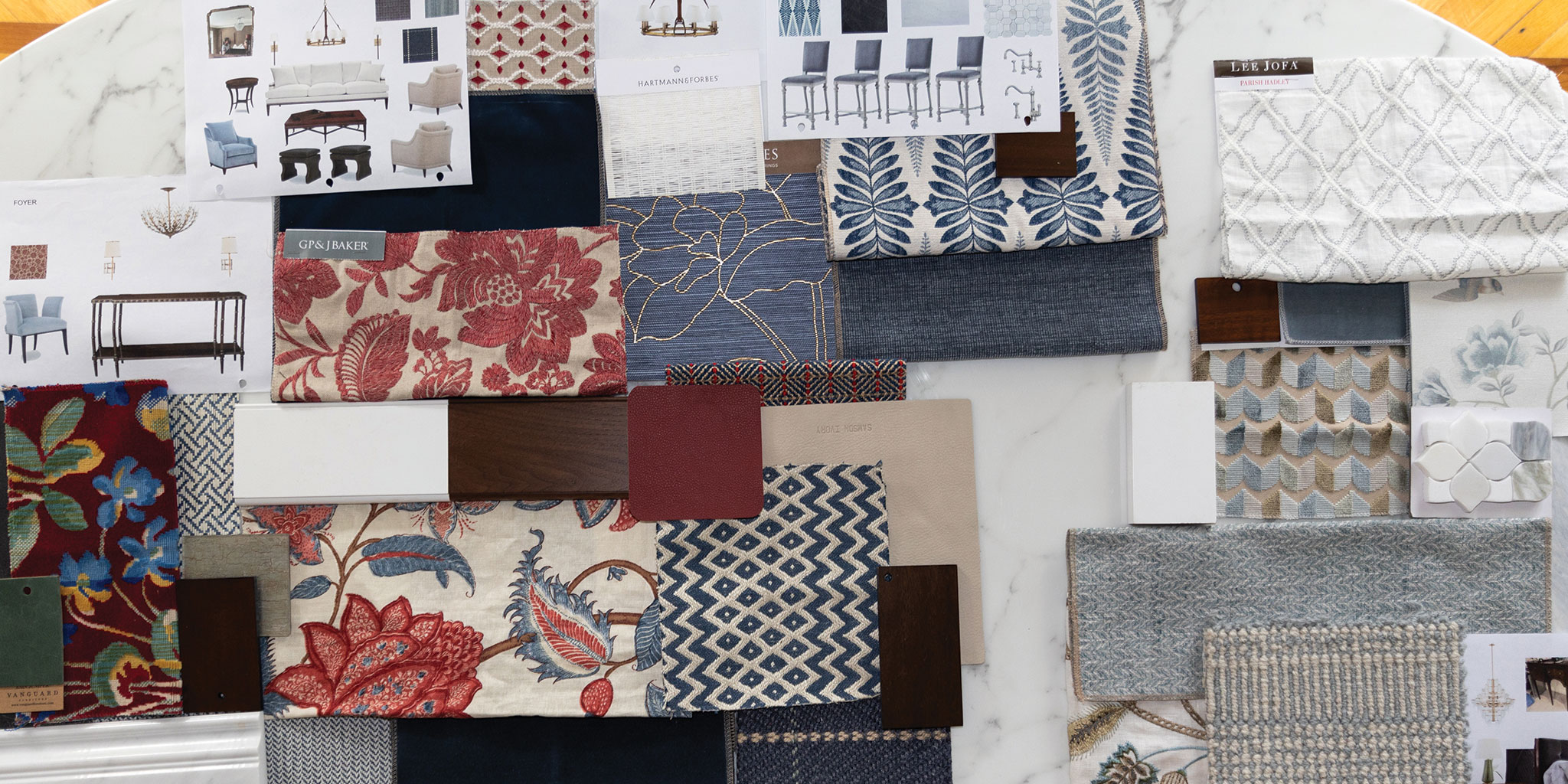 “It’s an updated traditional style that’s fresh, approachable and timeless,” says Gerace-Skinner. “We’ve considered classic marbles in areas throughout the home, including a gorgeous Bluette marble for the primary bathroom, a checkered black and Carrara marble for the mudroom, and marble mosaics for the backsplashes. We’re using dark walnut woods, traditional molding and a crisp palette of bold colors, yet keeping it bright and airy.”