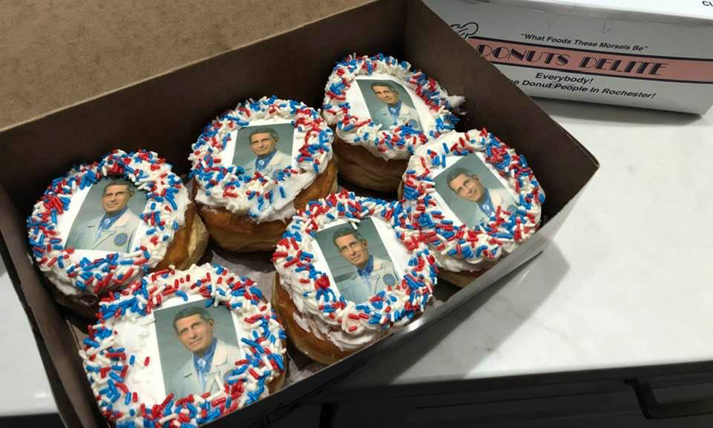 Another COVID-19-inspired culinary home run has come to our attention from about 3.5 hours west of Saratoga Springs in Rochester, NY—and while we feel it’s slightly less creative than the Collar City creation, it looks no less delicious. That would be the Dr. Anthony Fauci logo doughnut—or the “Fauci Donut,” for short—which Rochester’s Donuts Delite has been producing by the box-full since March 22. (It’s available only in the Rochester area for “touch-less delivery,” takeout and curb-side pickup.
