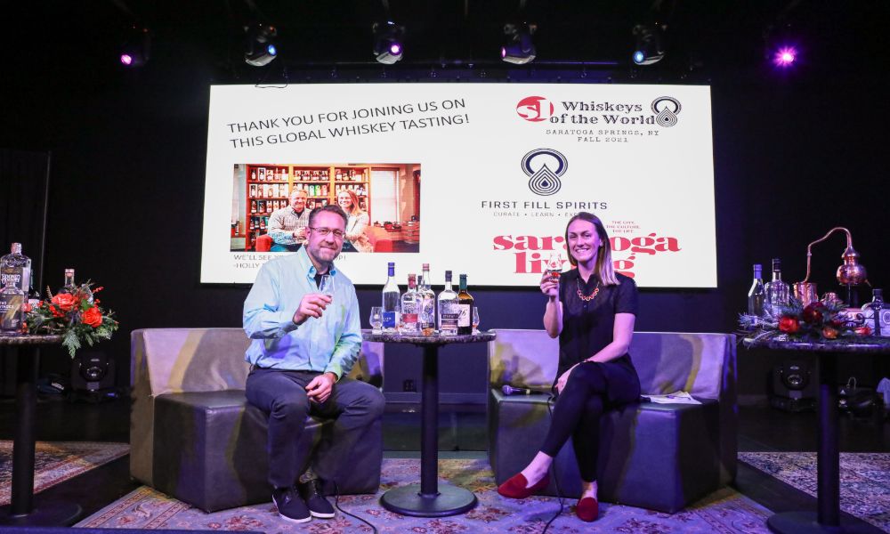 The City of Saratoga’s collective whiskey IQ shot up a couple points on November 17, as more than 60 whiskey drinkers—some new to the spirit, others veritable connoisseurs—listened intently to First Fill Spirits founders Holly Seidewand and Charles Grabitzky discuss six pours from around the globe. The event was Saratoga Living‘s Whiskeys of the World tasting at Putnam Place, hosted by Seidewand and Grabitzky, who opened Saratoga’s only boutique whiskey shop on Washington Street in August.