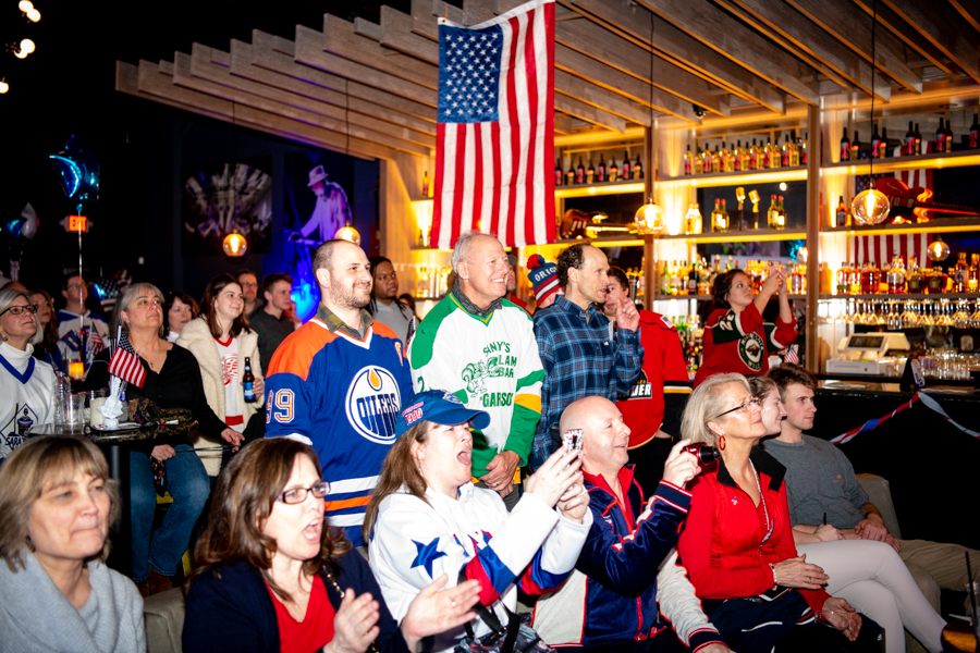 Around 6:30pm, general admission guests started pouring in, and were able to catch the tail end of the panel discussion, in which the former and current pros discussed the legacy of the Miracle game, how they’ve been influenced by Herb Brooks’ coaching style and the accuracy of the Disney movie about the 1980 team, Miracle. Then, after a breathtaking performance of the National Anthem by local vocal phenom Kelsey Dodd, the Miracle game started playing on Putnam Place’s 17-foot LED screen. Guests watched attentively as the US came from behind in the semifinal game, breaking out in celebration as the clock ticked down and hit zero, with US leading 4-3. (The crowd’s joy in the final seconds of the match was captured perfectly by photographer Hannah Lux; check out her photos in the gallery above.) It was February 22, 1980 all over again.