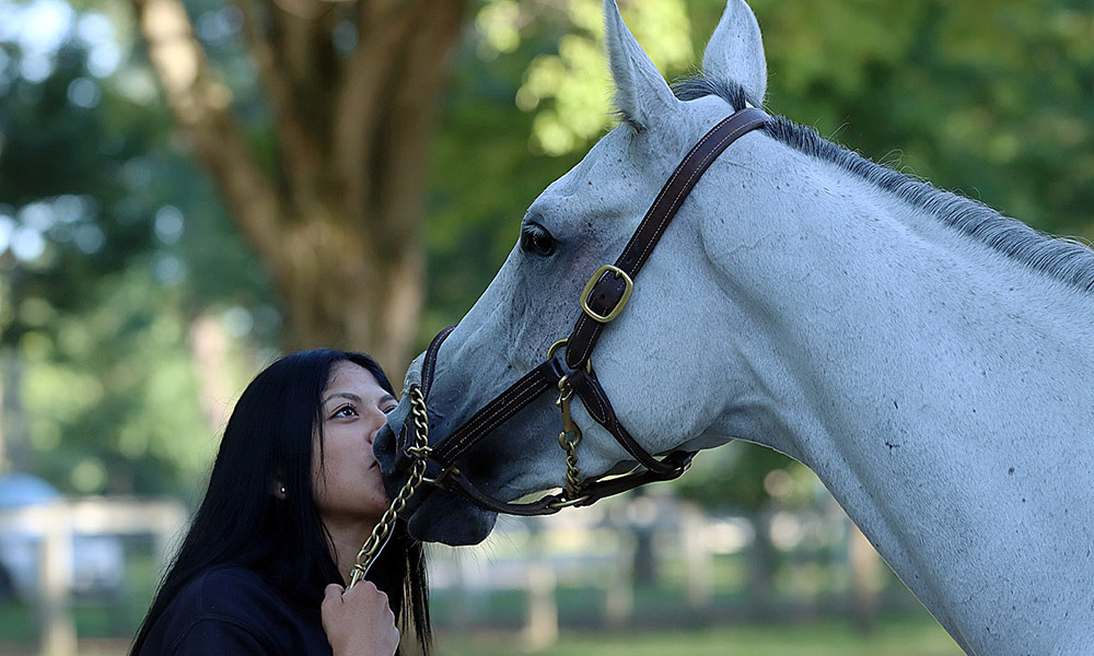 On his latest trip to the backstretch on Saturday, August 14, the day of the Grade 1 Fourstardave Handicap and Grade 2 Saratoga Special, Killips caught some early, early morning runs; shining horseshoes and indentations; and a particularly tender moment between a Thoroughbred and friend.