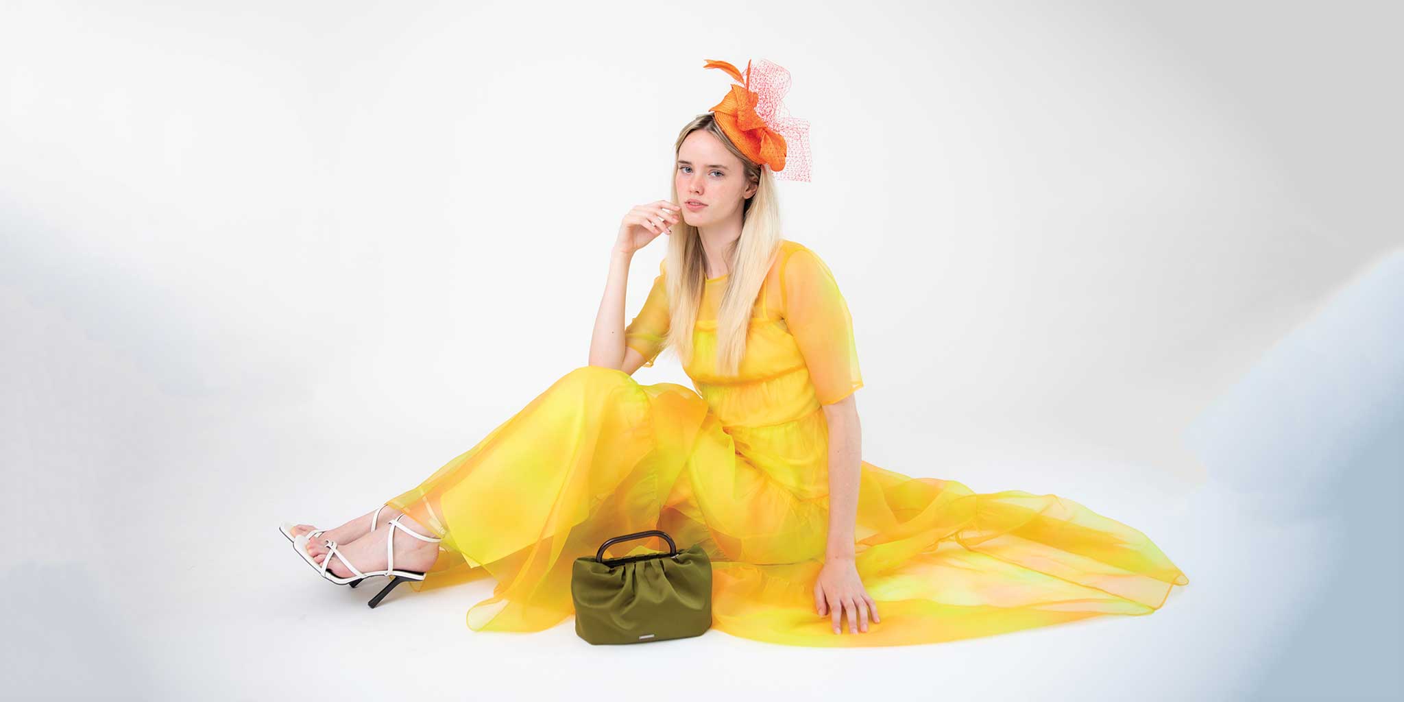 For my first look, I went big, bold and bright with a yellow, tiered maxi dress in sheer organza. Not only will it keep you nice and cool in the heat of the sun, but it will light up the Clubhouse on days when the sun chooses not to shine. Paired with a chic olive handbag and elegant orange fascinator, this ’fit certainly isn’t for those who want to blend in.