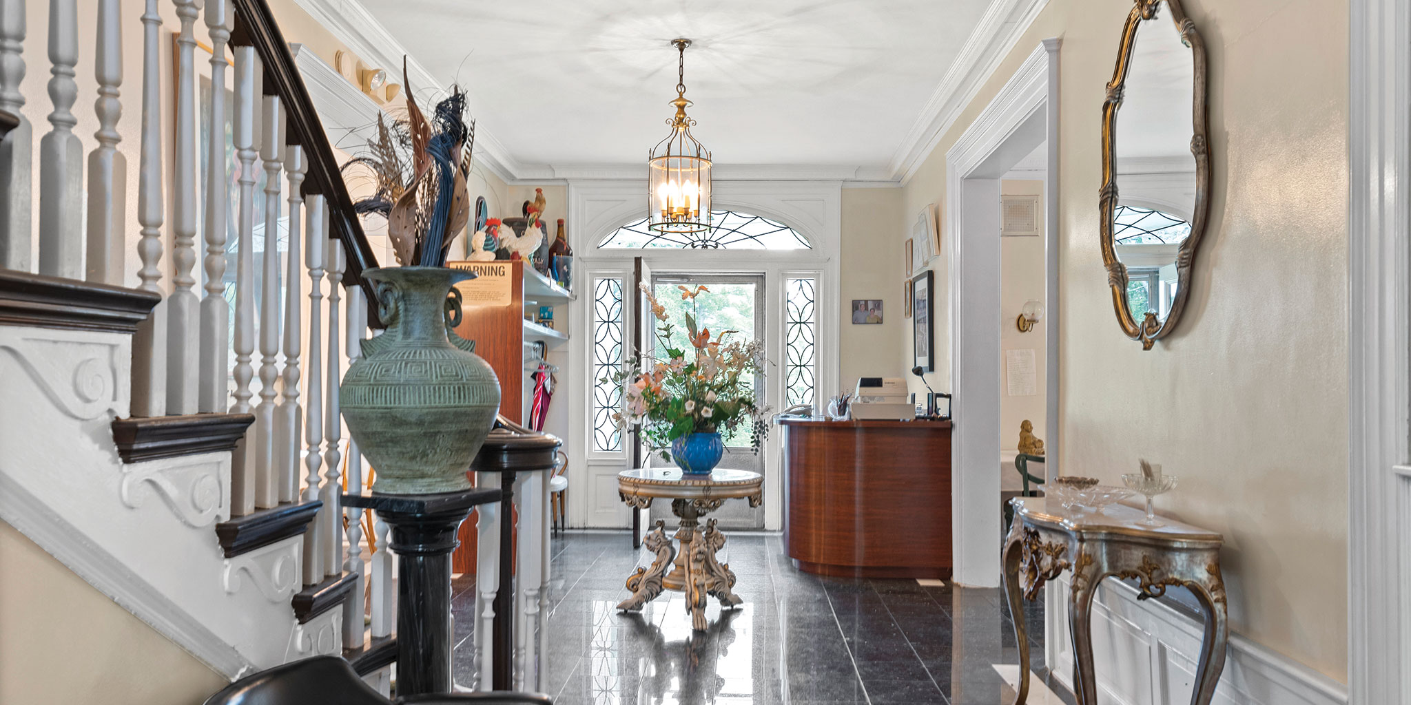 “It’s such a beautiful place,” says Amy Farchione Sgromo, who, along with Charles B. Goodridge, is representing the property for Julie & Co. Realty, LLC. “It’s set back from the road, so it’s quiet and has amazing views. I could see it as another restaurant, a bed and breakfast, or a wedding venue. Many of the bedrooms are en suites. Of course, it could also be restored to its original glory and would be a spectacular single-family home.”