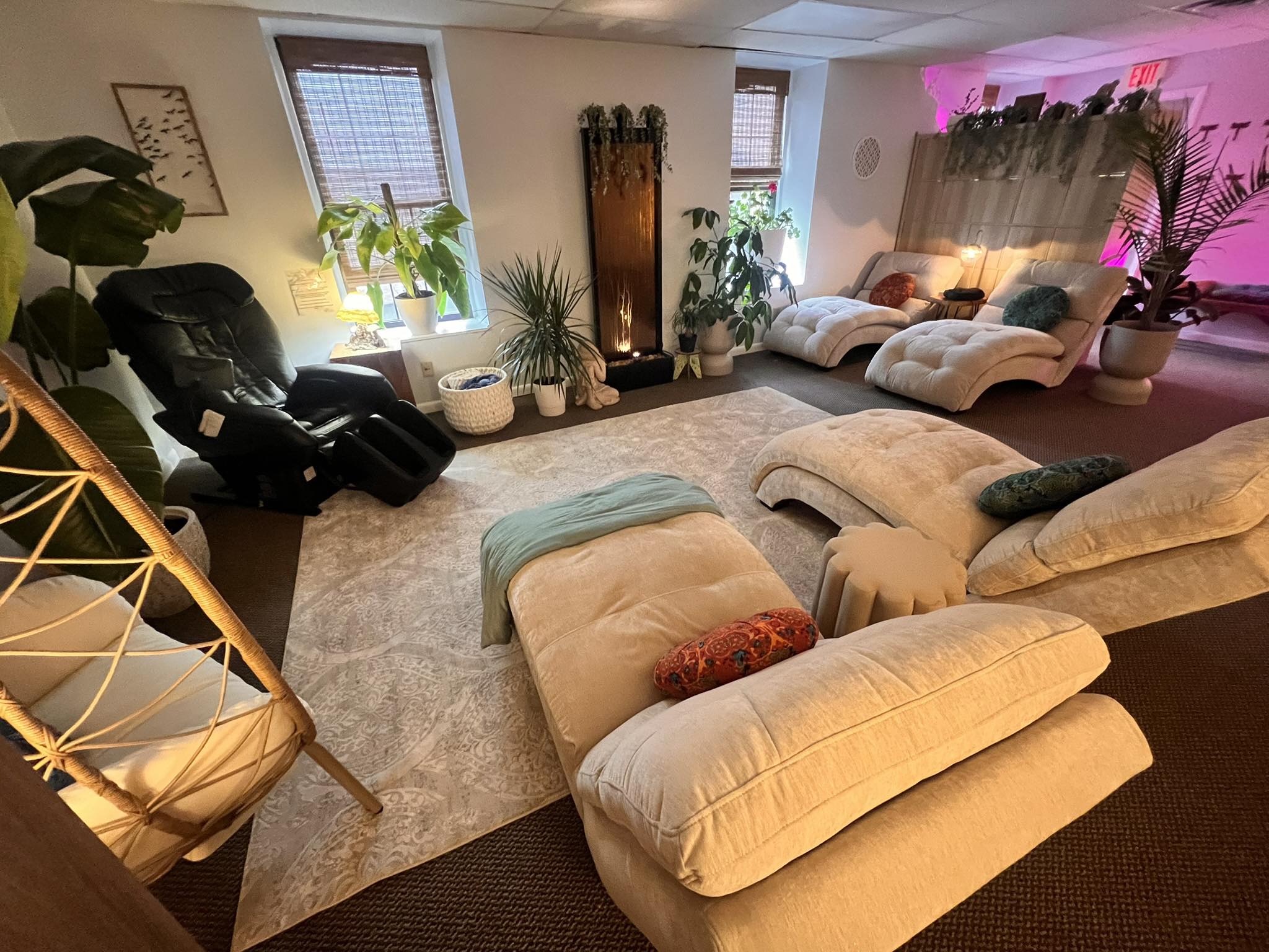 Instead, the space is home to a halotherapy salt booth, a red light therapy table, infrared sauna domes, PEMF mats, a controlled cold plunge tank, Korean massage beds, Normatec leg compression sleeves, and vibroacoustic meditation cushions. (Plus, a cozy lounge area for sharing a cup of tea.)