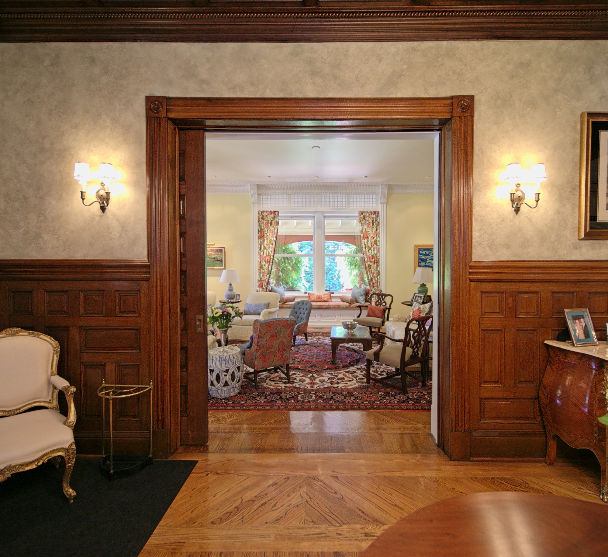 The home is a work of art in and of itself. At 9,000 square feet and boasting seven bedrooms, nine full bathrooms, five half-baths, and nine working fireplaces (eight gas, one wood), there’s something to behold at every turn, from stained-glass windows and hand-carved woodwork to elegant window seats and that porch.